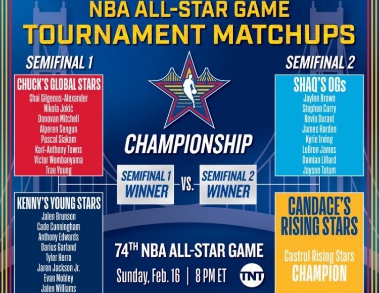 - 全明星正賽對(duì)陣情況:巴克利隊(duì)VS肯尼隊(duì) 奧尼爾隊(duì)VS新秀冠軍隊(duì)