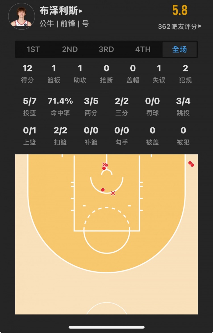 公牛11號(hào)秀 馬蒂斯-布澤利斯 登場(chǎng)19.1分鐘