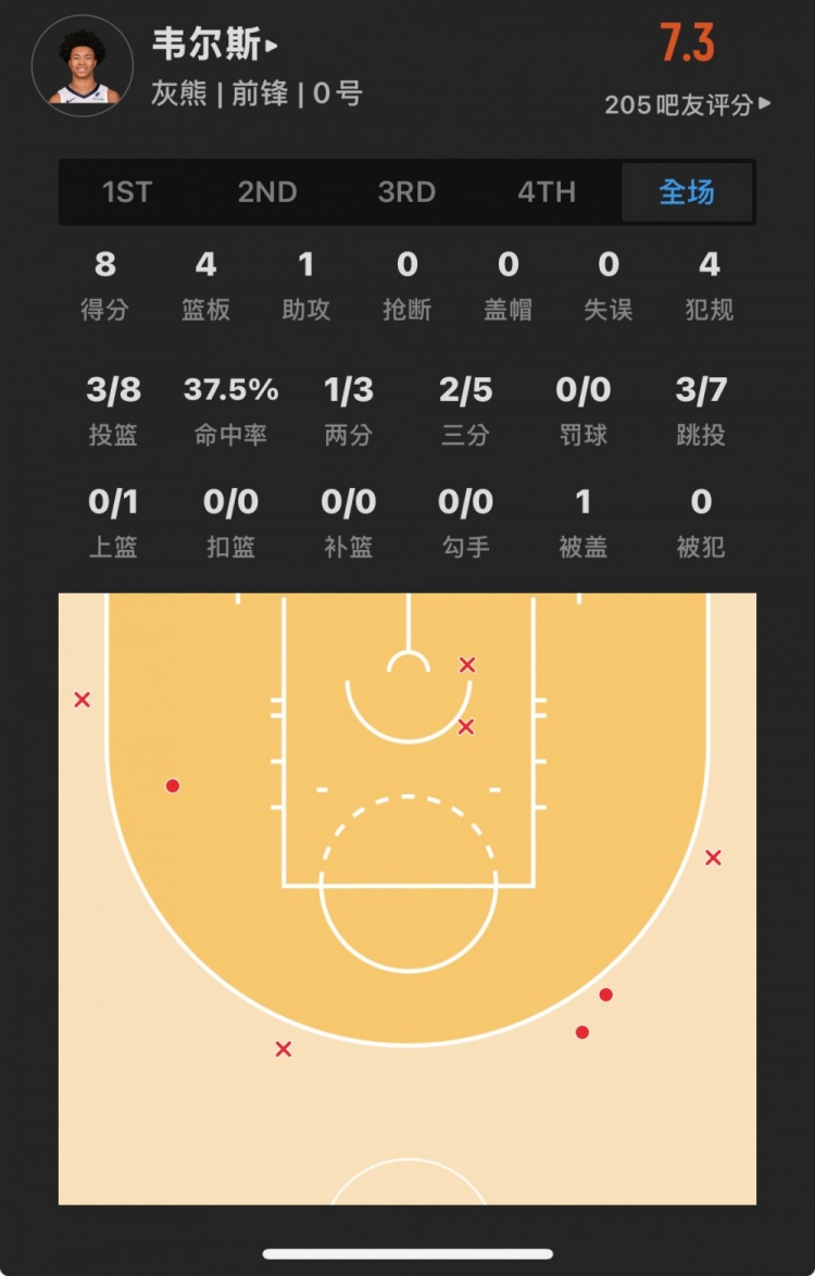 灰熊39號(hào)秀 杰倫-韋爾斯 登場(chǎng)19.3分鐘