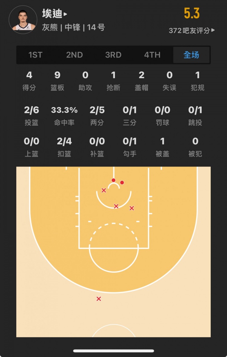 灰熊9號(hào)秀 扎克-埃迪 登場(chǎng)19.7分鐘