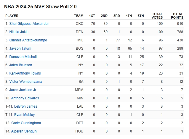 02月15日訊 在全明星間歇期到來之后,ESPN組織了100位記者、媒體人進行了賽季第二次MVP模擬投票,亞歷山大獲得了70張第一選票,高居榜首,約基奇拿到了30張第一選票,兩人包攬了所有的第一選票;字母哥票數(shù)總分排名第三,第四是塔圖姆,文班亞馬位居第七,詹姆斯和埃文-莫布里并列第11。