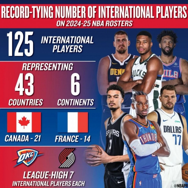 最近幾年趨勢發(fā)生了轉向。2017/18賽季,還有2023/24和2024/25賽季,以NBA揭幕戰(zhàn)的時間點統(tǒng)計,國際球員的數(shù)量都達到了歷史最高的125人,占聯(lián)盟球員數(shù)量的1/4了。