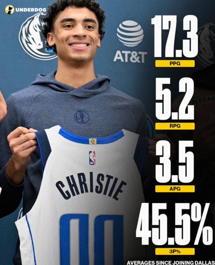 在加盟獨(dú)行俠后,克里斯蒂場(chǎng)均場(chǎng)均拿下17.3分5.2籃板3.5助攻,三分命中率45.5%。