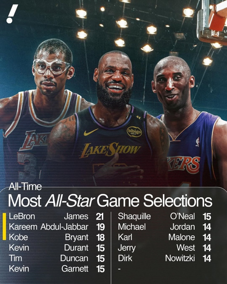 - 全明星次數(shù)總榜:詹姆斯21次高居榜首 科比第三 KD與三大名宿并列