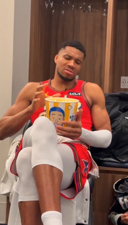 賽前,字母哥在更衣室大吃“庫里爆米花”,同時(shí),字母哥問道:“吃這個(gè)能讓你的投籃更準(zhǔn)嗎?”
