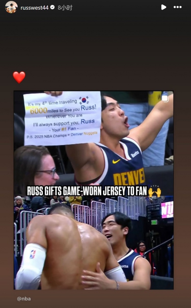 今天,一位來自韓國的球迷現(xiàn)場舉牌觀戰(zhàn),牌子上寫道:“這是我第四次跋涉6000英里(1英里≈1.61公里、6000英里≈9660公里)來看你,威少。不管你在哪里,我都會支持你。你的頭號粉絲。PS:2025年NBA總冠軍=丹佛掘金?!?/p>