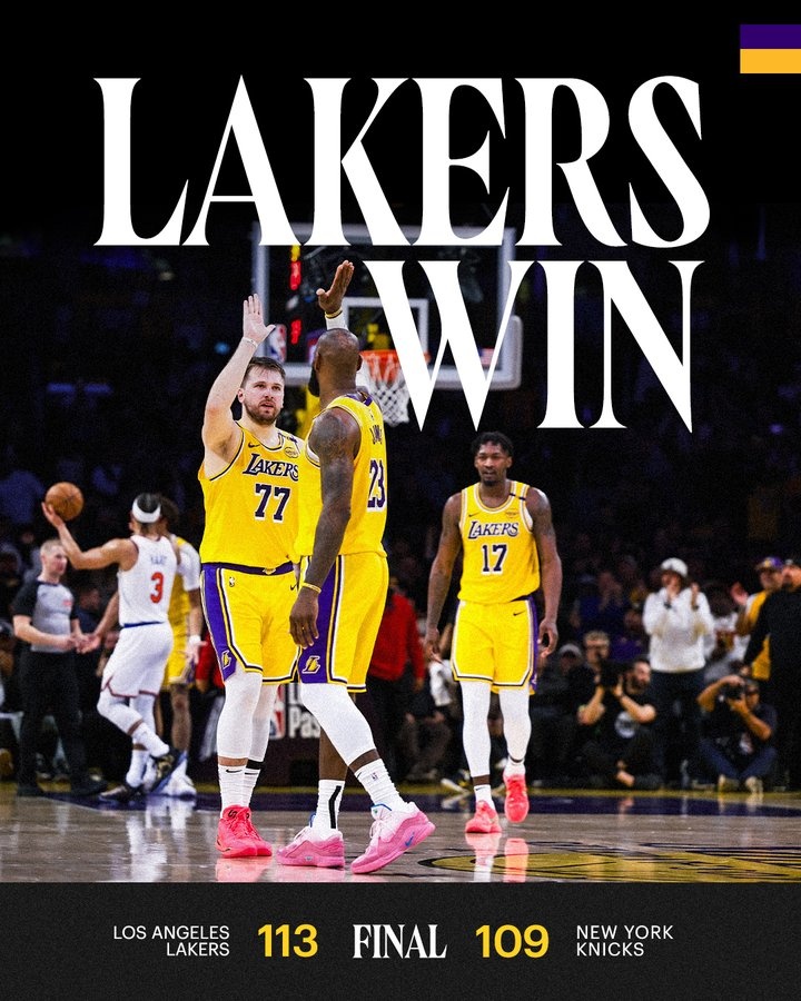 賽后湖人官方曬出本場贏球海報(bào),詹姆斯、東契奇和芬尼-史密斯登上封面。