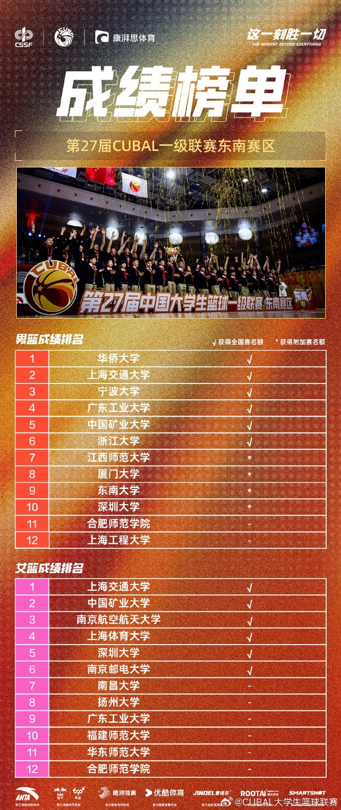 東南賽區(qū)結(jié)束,男籃方面華僑大學(xué)、上海交大、寧波大學(xué)、廣東工大、中國(guó)礦大、浙江大學(xué)直通全國(guó)三十二強(qiáng),江西師大、廈門大學(xué)、東南大學(xué)、深圳大學(xué)落入附加賽。