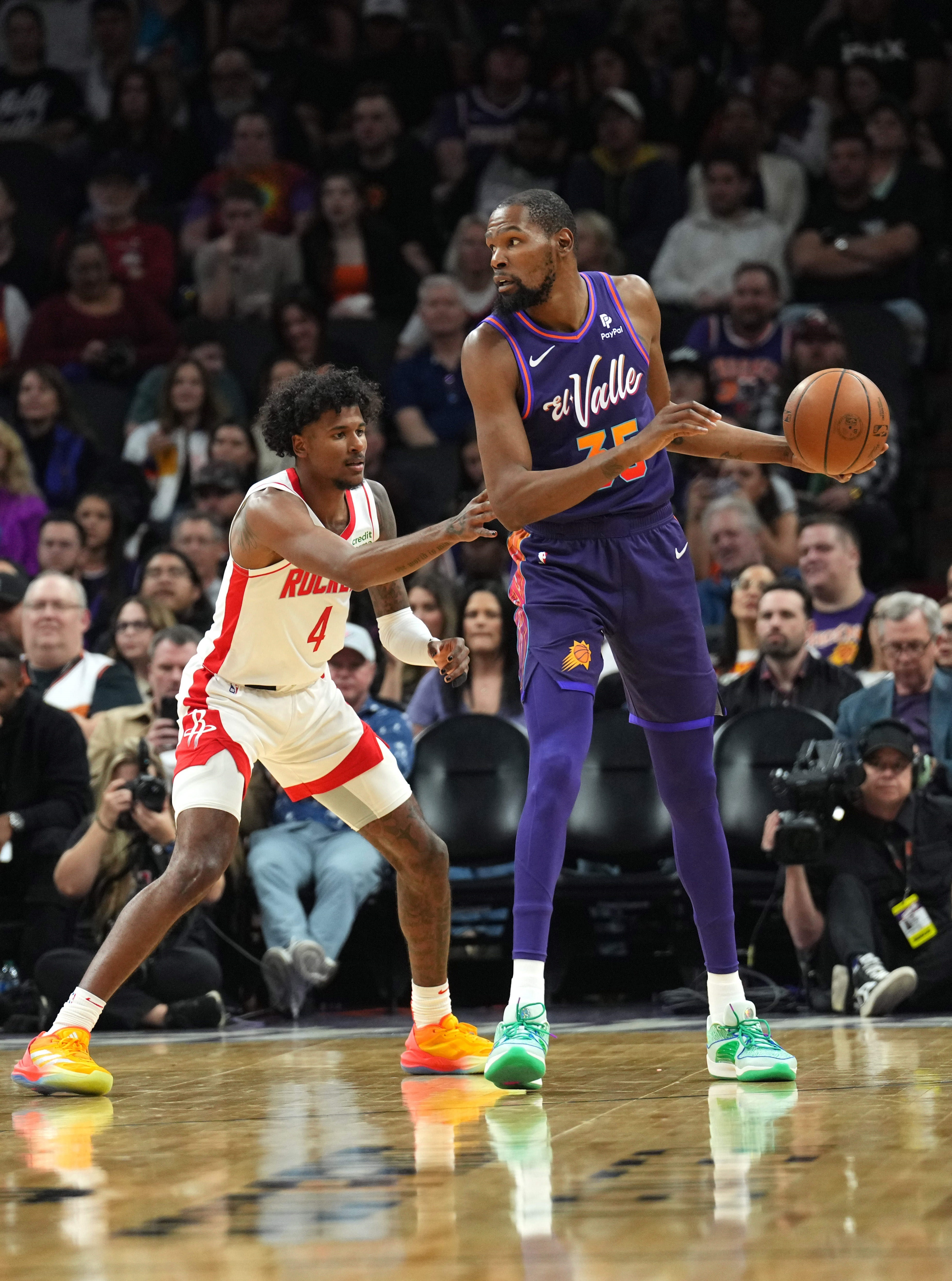 火箭是太陽完美的交易伙伴,主要有兩個(gè)原因。首先,杜蘭特完美填補(bǔ)了火箭最大的短板。憑借年輕的核心陣容和強(qiáng)悍的防守,火箭正在西部崛起。但他們?nèi)狈σ晃荒軌驇ьI(lǐng)球隊(duì)爭(zhēng)冠的頂級(jí)得分手,根據(jù)Cleaning the Glass網(wǎng)站的數(shù)據(jù),本賽季火箭的半場(chǎng)進(jìn)攻效率僅排名聯(lián)盟第25位。即使已經(jīng)36歲,杜蘭特也能在這一領(lǐng)域帶來顯著提升,他的使用率和真實(shí)命中率都遠(yuǎn)高于火箭輪換陣容中的任何一名球員。其次,火箭控制著太陽2025年、2027年和2029年的首輪簽,這些首輪簽最初是太陽在交易杜蘭特時(shí)送給籃網(wǎng)的。重新獲得部分或全部首輪簽將使太陽能為杜蘭特時(shí)代畫上圓滿句號(hào),同時(shí)也讓球隊(duì)能夠在未來自由操作,而不必?fù)?dān)心失去樂透簽的風(fēng)險(xiǎn)。