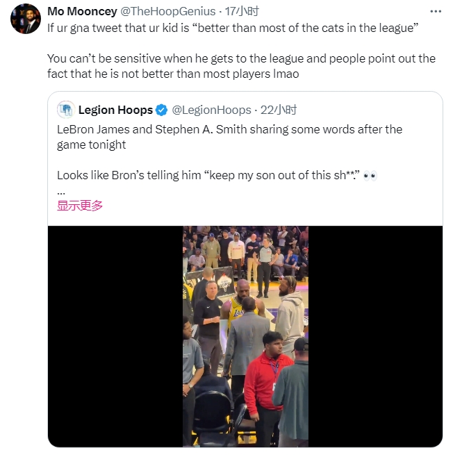 賽后,詹姆斯找到A史密斯對(duì)峙,詹姆斯表示:“老子不在乎,兄弟!不要把我兒子扯進(jìn)來,兄弟!”