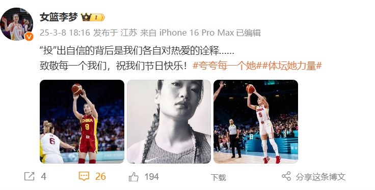 3月8日訊 今日,中國(guó)女籃球員李夢(mèng)更新社媒,曬出了一組照片。李夢(mèng)配文:”‘投’出自信的背后是我們各自對(duì)熱愛(ài)的詮釋。致敬每一個(gè)我們,祝我們節(jié)日快樂(lè)!“本賽季至今,李夢(mèng)場(chǎng)均得到14.7分2.4籃板4.9助攻。 本文標(biāo)簽: 籃球 CBA 中國(guó)籃球 WCBA 轉(zhuǎn)載