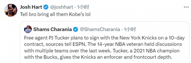 3月9日訊 據(jù)名記Shams報(bào)道,消息人士透露,PJ-塔克計(jì)劃與尼克斯簽下一份十天短合同。尼克斯球員哈特調(diào)侃道:“告訴兄弟,把他的所有科比鞋都帶來。”值得一提的是,塔克收藏了大量的稀有球鞋。 本文標(biāo)簽: 籃球 NBA 尼克斯