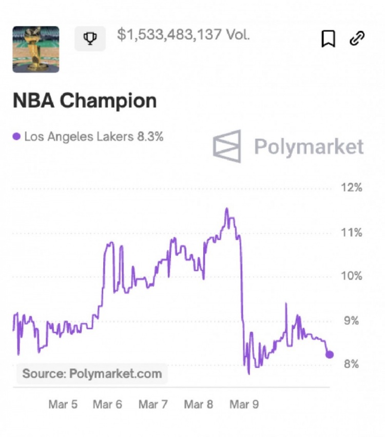 3月11日訊 今日湖人108-111不敵籃網(wǎng)。賽后美媒Polymarket更新了湖人的奪冠概率——8.3%。值得一提的是,在詹姆斯受傷后,湖人奪冠概率由11%+下降了大概3個百分點。 本文標簽: 籃球 NBA 湖人 詹姆斯