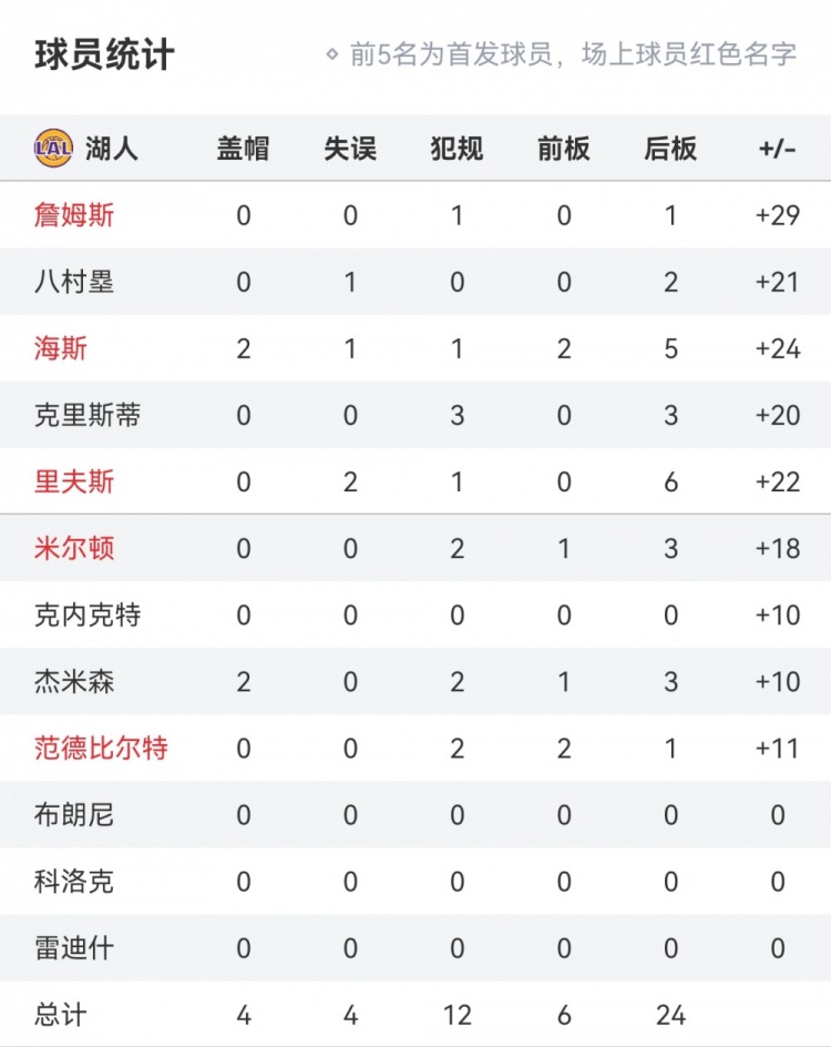 1月31日訊 NBA常規(guī)賽,湖人半場78-45領(lǐng)先奇才。半場比賽,湖人每名出場球員正負(fù)值都很高,均達(dá)到了兩位數(shù)。 本文標(biāo)簽: 籃球 NBA 湖人