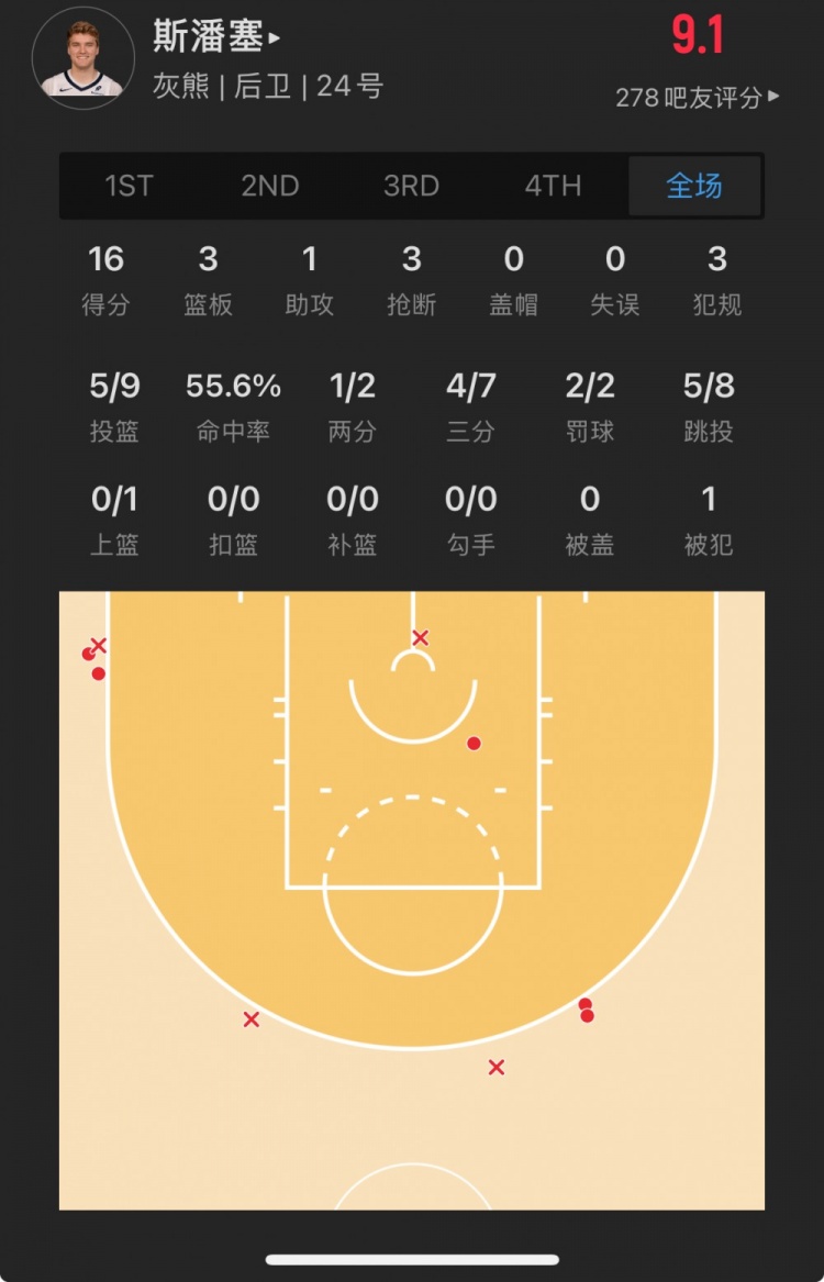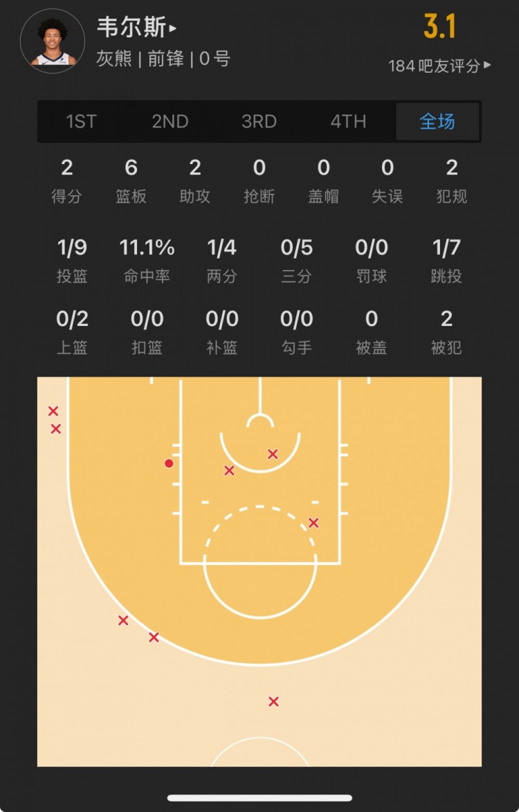 灰熊39號(hào)秀 杰倫-韋爾斯 登場(chǎng)23.3分鐘