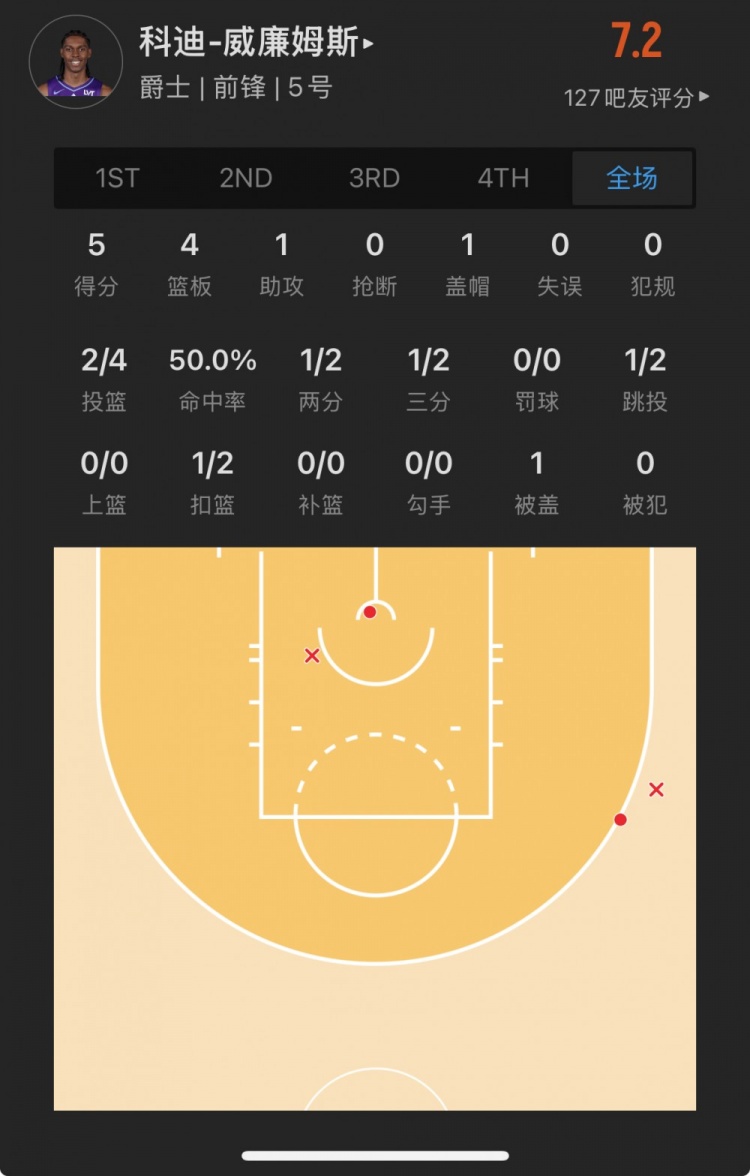 爵士10號(hào)秀 科迪-威廉姆斯 登場(chǎng)16.3分鐘