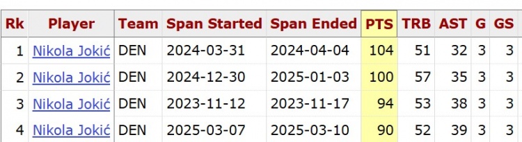 據(jù)統(tǒng)計(jì),約基奇在連續(xù)3場比賽中至少得到90分50籃板30助攻,自聯(lián)盟合并以來唯一,而且他生涯已經(jīng)是第4次做到這一點(diǎn)。