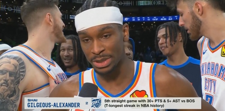3月13日訊 NBA常規(guī)賽,雷霆118-112戰(zhàn)勝凱爾特人。本場比賽,雷霆球星亞歷山大在39分鐘的時間里,投籃20中11,三分球7中2,罰球11中10,砍下34分5籃板7助攻1搶斷的數(shù)據(jù)。據(jù)統(tǒng)計,亞歷山大對陣凱爾特人已經(jīng)連續(xù)5場拿下至少30分5助攻,追平NBA歷史紀錄! 本文標簽: 籃球 NBA 雷霆 凱爾特人 亞歷山大