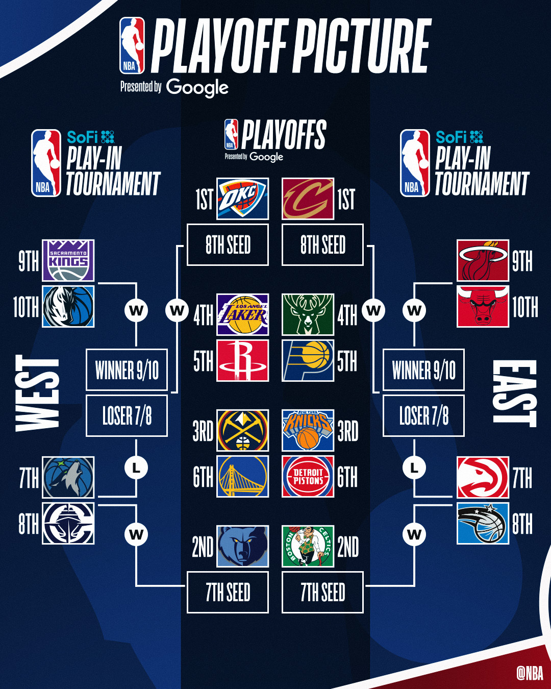 東部方面,雄鹿vs步行者;尼克斯vs活塞;附加賽區(qū)熱火、公牛、老鷹、魔術(shù)爭奪最后的兩個季后賽席位,勝者(第8)vs騎士,負者(第7)vs凱爾特人。