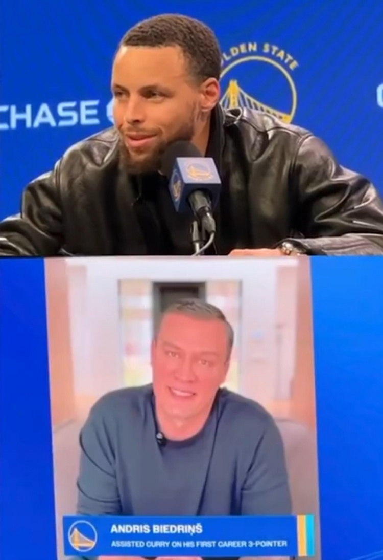 庫(kù)里命中4000記三分比賽暫停之后,大屏幕播放視頻紀(jì)念這一時(shí)刻,視頻中比德林斯助攻了庫(kù)里生涯的第一記三分,這也讓庫(kù)里感慨頗深。