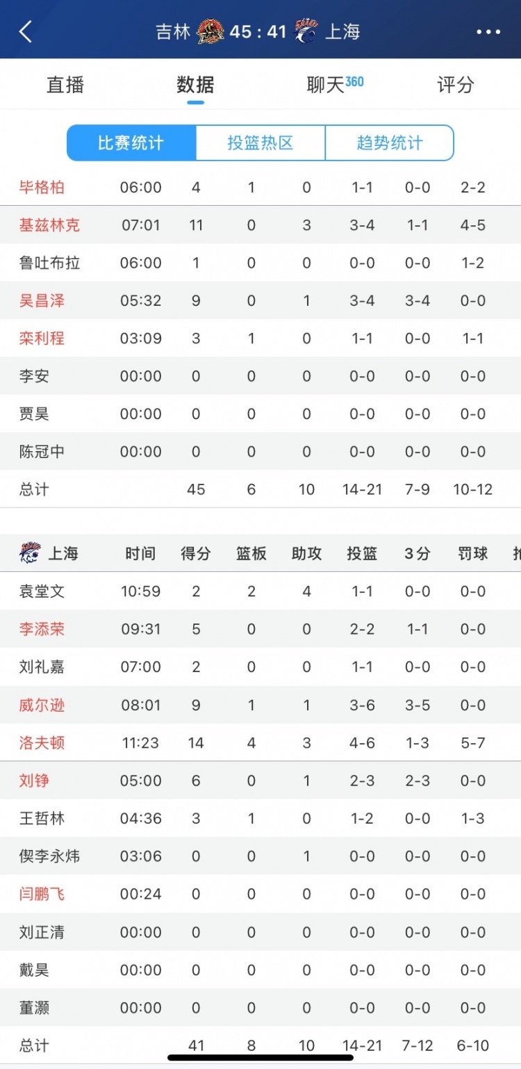 首節(jié)比賽,兩隊(duì)上來(lái)就展開(kāi)對(duì)轟大戰(zhàn),兩隊(duì)內(nèi)外線都手感火熱,都是21投14中(吉林三分9中7,上海三分12中7);吉林罰球12中10,上海罰球10中6,。