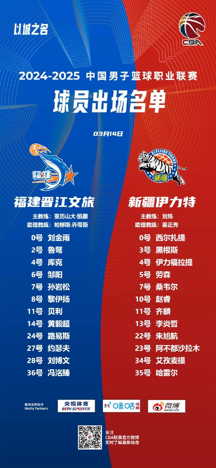 福建隊(duì):劉金雨、魯驁、庫克、鄒陽、孫巖松、黎伊揚(yáng)、貝利-斯蒂爾、黃毅超、路易斯、約瑟夫-楊、劉博文、馮洺臻