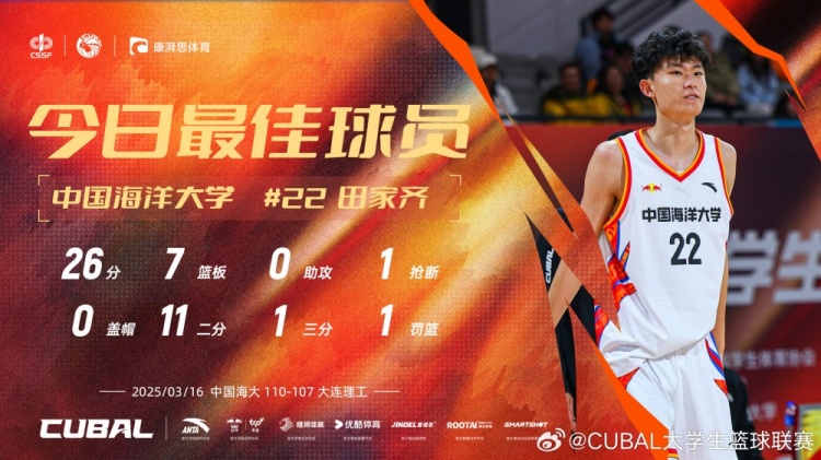 在今日的比賽中,大前鋒田家齊以26分7籃板的狂暴表現(xiàn),率領(lǐng)中國海洋大學(xué)110-107力克大連理工,彌補(bǔ)去年全國賽6分落敗的遺憾。這位身披22號戰(zhàn)袍的內(nèi)線猛獸,用籃下9投7中的高效終結(jié)鑿穿對手禁區(qū)。其5個(gè)進(jìn)攻籃板直接轉(zhuǎn)化為二次進(jìn)攻得分,恰是去年那場失利留下的成長的痕跡。當(dāng)技術(shù)統(tǒng)計(jì)表上“0失誤”與“57%真實(shí)命中率”冰冷陳列,這位大前鋒用最熾熱的方式完成了對過去的回首:去年遺憾落敗的夜晚,他掩面落淚;今夜,他成了親手拆解對手的禁區(qū)判官。
