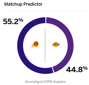 ESPN賽前預(yù)測(cè)兩隊(duì)本場(chǎng)勝率:太陽(yáng)55.2%、湖人44.8%。