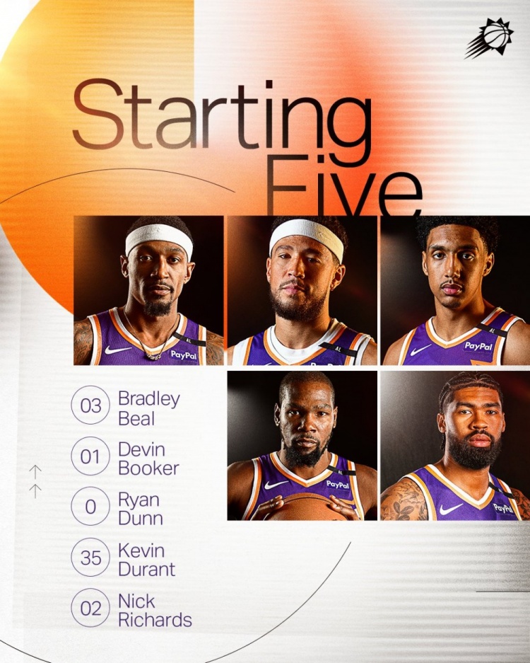 杜蘭特、布克、比爾、鄧恩、理查茲將首發(fā)出場。