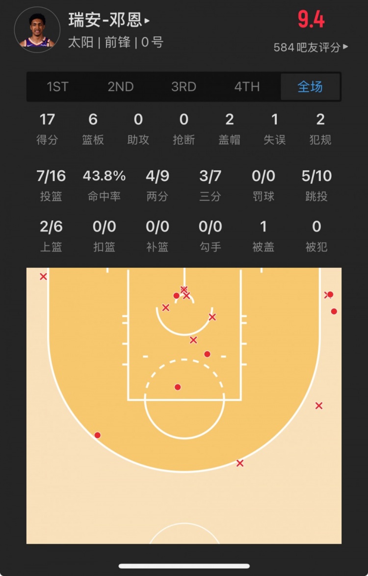 太陽(yáng)28號(hào)秀 瑞安-鄧恩 登場(chǎng)24.3分鐘