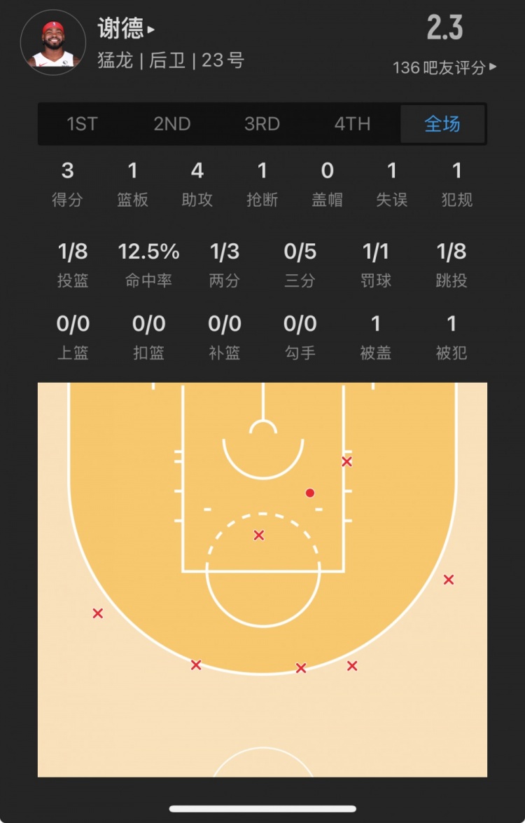 猛龍45號(hào)秀 賈馬爾-謝德 登場(chǎng)23.2分鐘