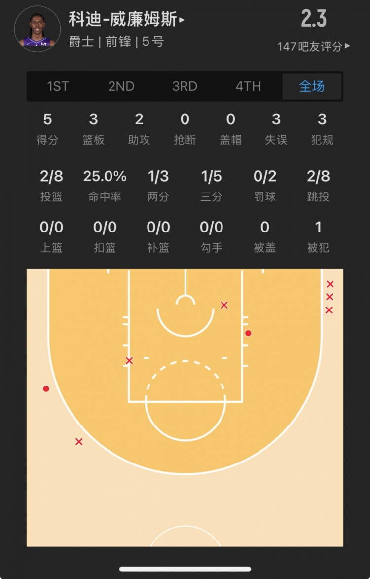 爵士10號(hào)秀 科迪-威廉姆斯 登場(chǎng)27.4分鐘