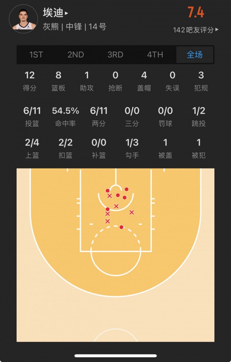 灰熊9號(hào)秀 扎克-埃迪 登場(chǎng)24.4分鐘