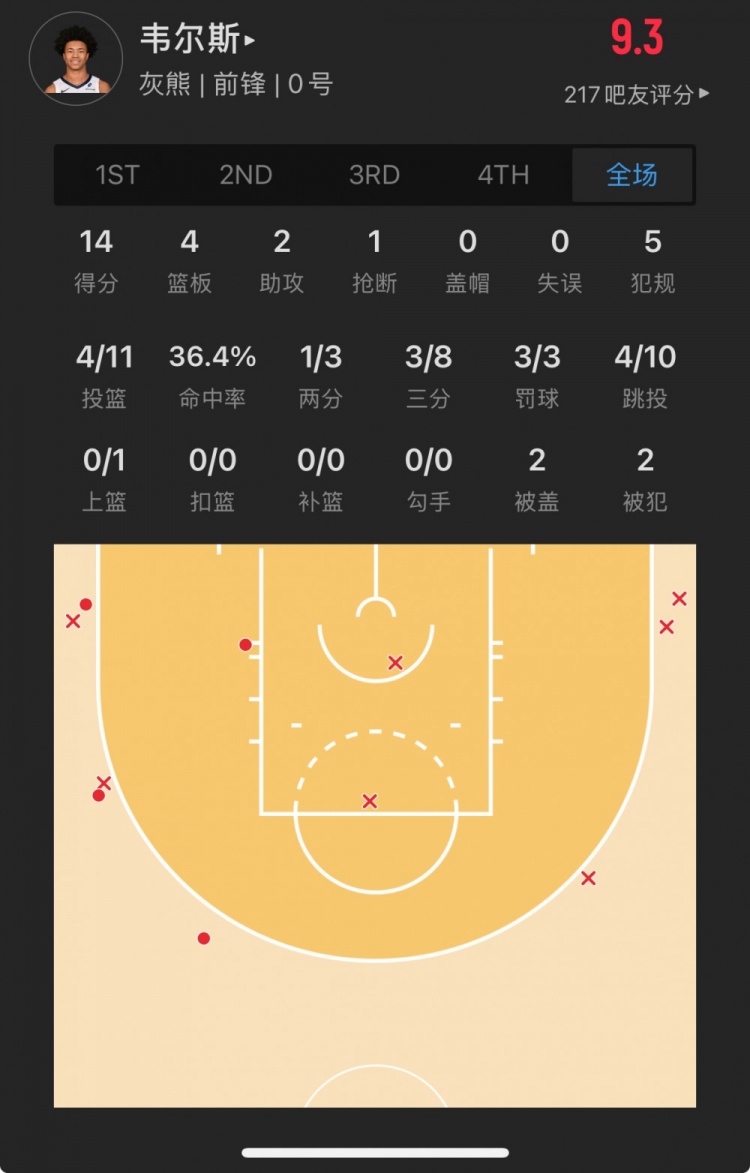 灰熊39號(hào)秀 杰倫-韋爾斯 登場(chǎng)33.6分鐘