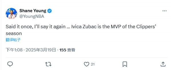 3月19日訊 今日NBA常規(guī)賽,快船主場132-119力克聯(lián)盟第一騎士。祖巴茨本場比賽面對騎士雙塔大發(fā)神威,全場18中13爆砍28分20籃板。對此,美記Shane Young發(fā)推寫道:“再說一次,我還會繼續(xù)說——祖巴茨就是快船本賽季的MVP!” 本文標簽: 籃球 NBA 快船