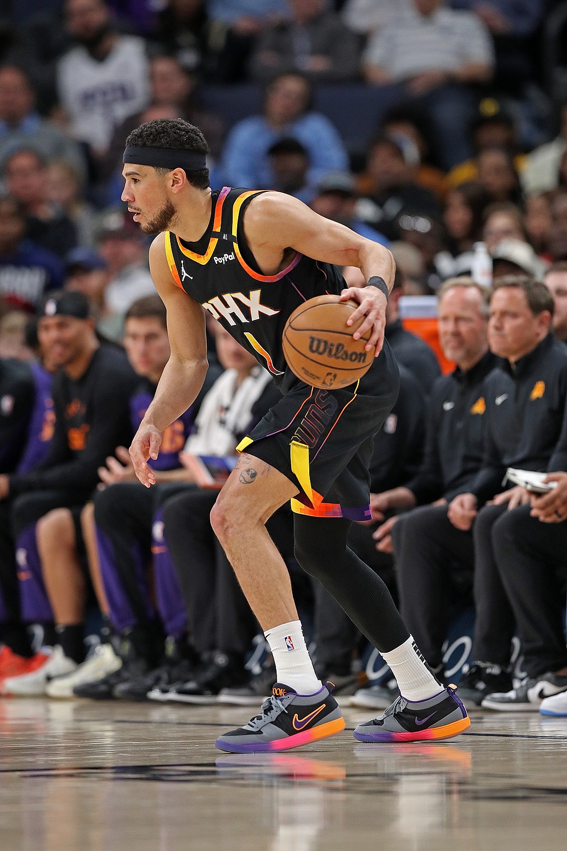 理查茲、比爾、普拉姆利、阿倫四位主要輪換球員缺陣,太陽(yáng)首發(fā)擺杜蘭特+布克+鄧恩+伊戈達(dá)羅+吉萊斯皮,雖然缺兵少將,但圍繞杜蘭特和布克高位擋拆打阿倫依然成功搶到了開(kāi)局的先手。