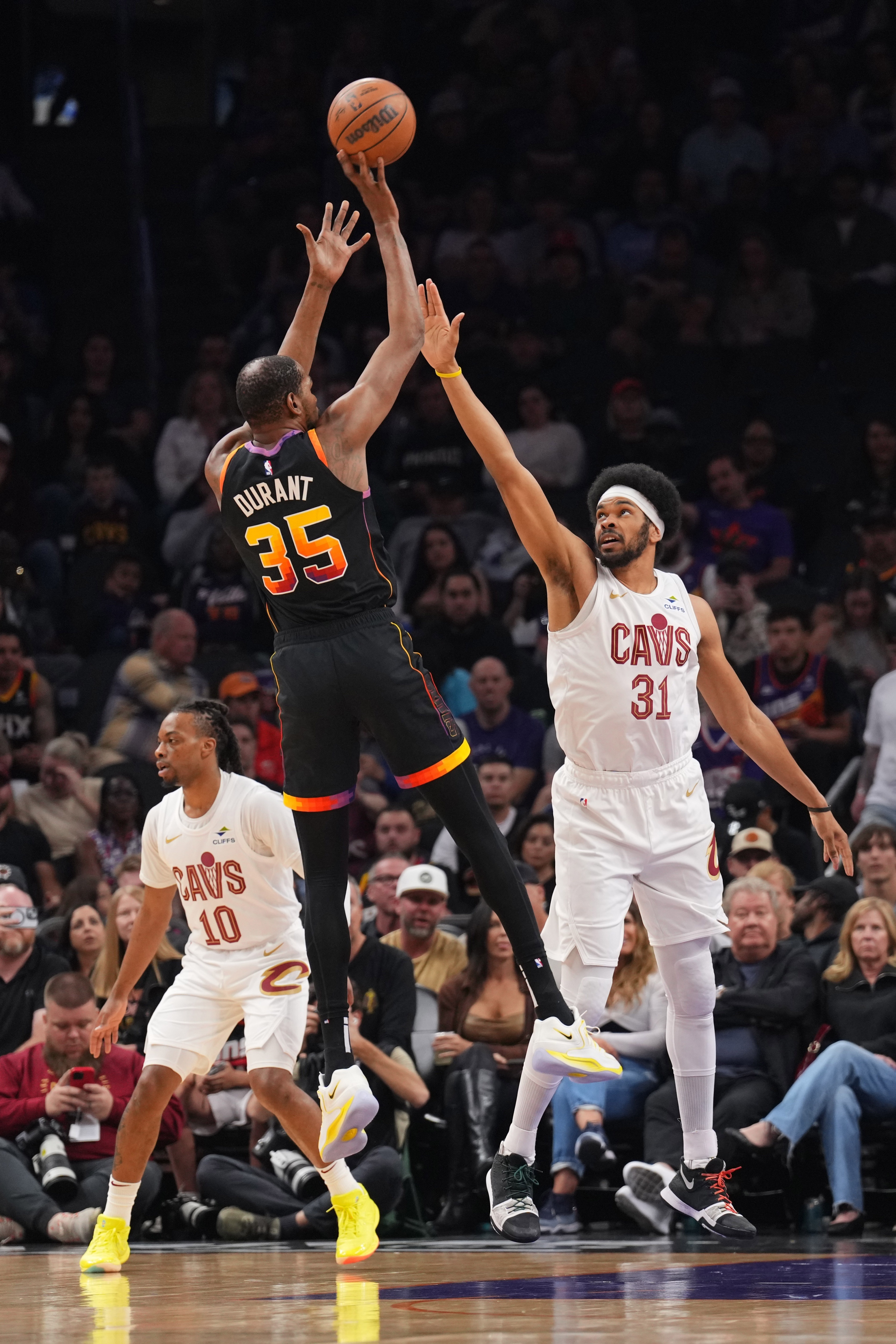 太陽(yáng)下半場(chǎng)繼續(xù)點(diǎn)名軍訓(xùn)騎士的防守弱環(huán),杜蘭特?fù)醪瘘c(diǎn)名米切爾和斯特魯斯單打,無(wú)差別中距離單打騎士最好的防守者莫布里;布克也點(diǎn)名米切爾和加蘭,騎士單防壓力巨大,無(wú)奈采用了聯(lián)防,但被吉萊斯皮和鄧恩大空位三分射穿,太陽(yáng)一度建立起20分領(lǐng)先優(yōu)勢(shì)。