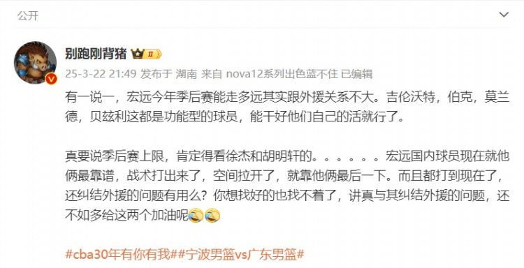 @別跑剛背豬 在個(gè)人微博上寫(xiě)道:“有一說(shuō)一,宏遠(yuǎn)今年季后賽能走多遠(yuǎn)其實(shí)跟外援關(guān)系不大。吉倫沃特,伯克,莫蘭德,貝玆利這都是功能型的球員,能干好他們自己的活就行了。