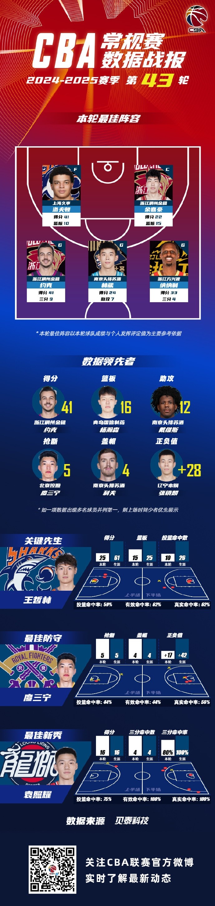 數(shù)據(jù)領(lǐng)先者方面:浙江稠州金租球員約克以單場41分的數(shù)據(jù)領(lǐng)銜得分榜;