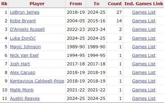 據(jù)統(tǒng)計(jì),這是東契奇到湖人后第2場(chǎng)比賽至少30分5板5助攻同時(shí)命中5三分,追平拉塞爾,并列隊(duì)史第3多,僅次于詹姆斯(27)、科比(14)。