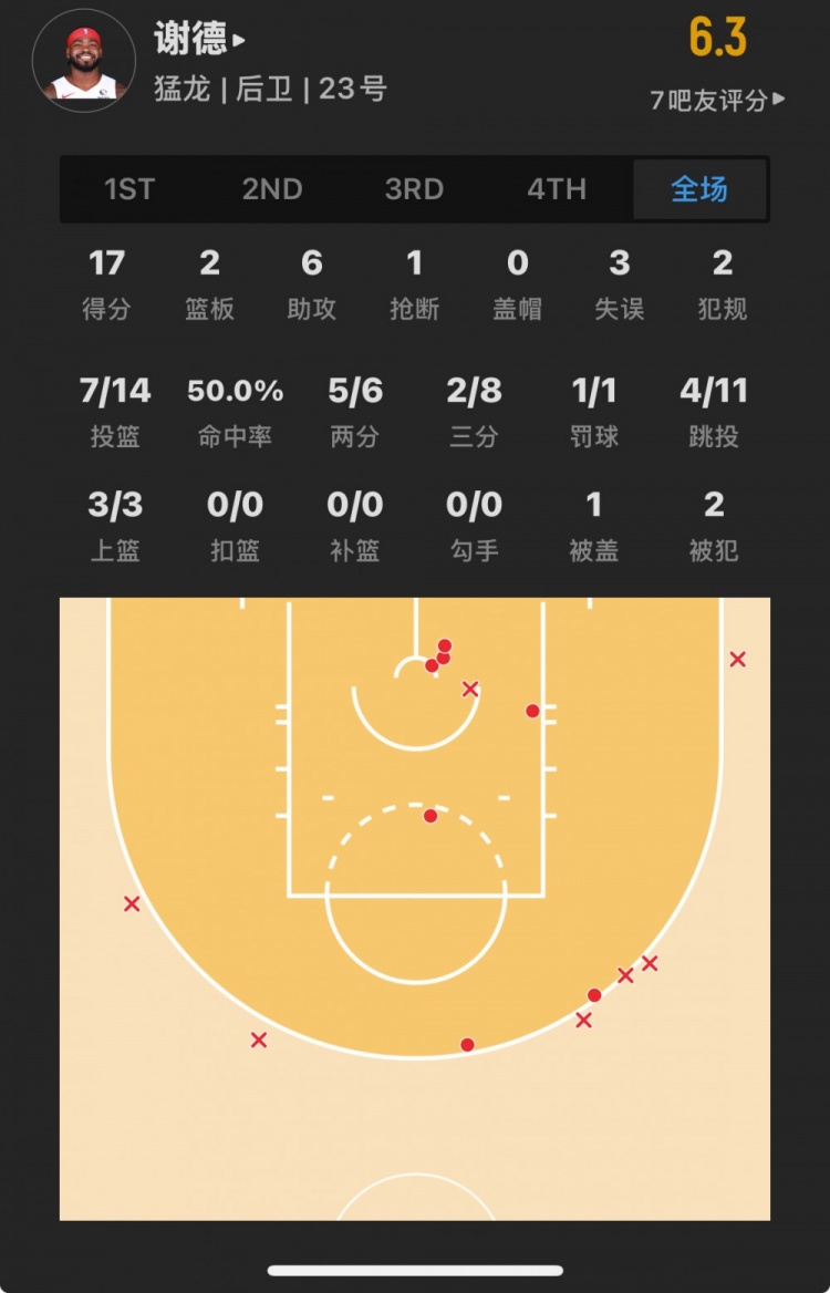 猛龍45號(hào)秀 賈馬爾-謝德 登場(chǎng)27.4分鐘