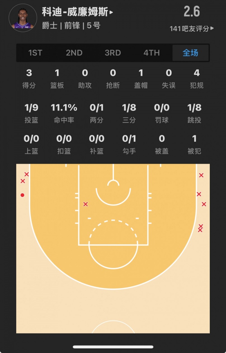 爵士10號(hào)秀 科迪-威廉姆斯 登場(chǎng)22.4分鐘