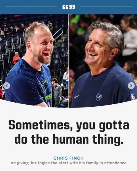 比賽的結(jié)果也許并不是那么重要,拿下聯(lián)盟墊底的球隊(duì)并不意味著森林狼就能確保打進(jìn)季后賽。但對(duì)英格爾斯來(lái)說(shuō),他是這場(chǎng)比賽絕對(duì)的主角,隊(duì)友、保安、工作人員、媒體,所有了解內(nèi)幕的人都在祝福他。正像妻子蕾娜在社交媒體上說(shuō)的,“對(duì)我們和我們的家人來(lái)說(shuō),今晚真的比籃球更重要。”