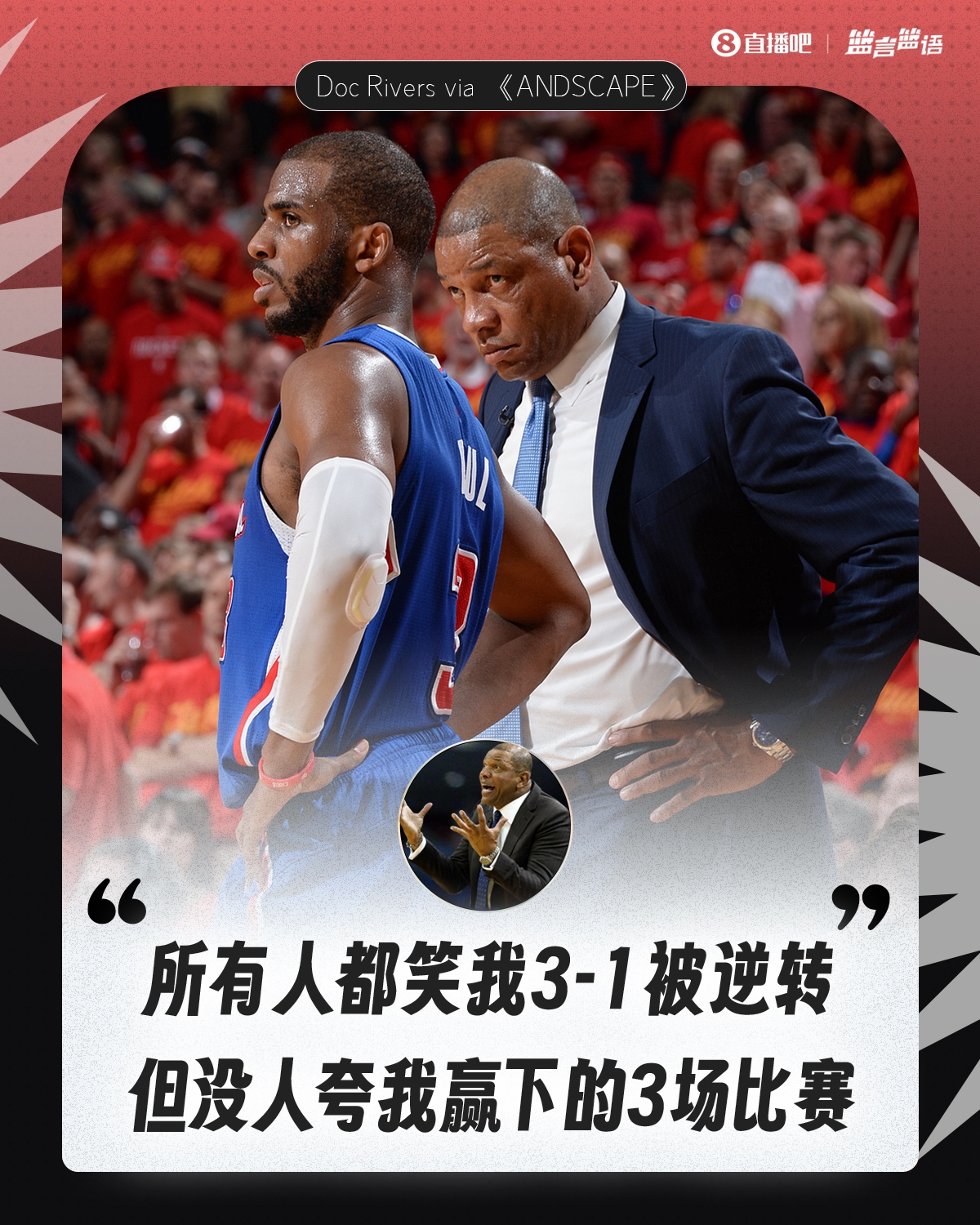 在談到自己飽受詬病的“系列賽多次3比1領(lǐng)先被翻盤(pán)”的話題時(shí),里弗斯坦然表示:“我曾帶領(lǐng)一支排名第8的球隊(duì)3比1領(lǐng)先。在快船的那次是唯一一次讓勝利溜走了,沒(méi)有人講出真實(shí)的故事,沒(méi)人意識(shí)到保羅當(dāng)時(shí)拖著一條傷腿在場(chǎng)上奔跑。這在某種程度上是不公平的,我贏得3場(chǎng)勝利沒(méi)有得到足夠的認(rèn)可,大家只記住了輸?shù)舻谋荣?。我總是說(shuō),‘如果我們6場(chǎng)內(nèi)輸給火箭會(huì)怎樣?那就沒(méi)人在意了。’”