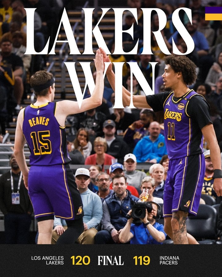 3月27日訊 NBA常規(guī)賽,湖人客場120-119絕殺步行者。賽后湖人官方曬出贏球海報,里夫斯和海斯擊掌的畫面登上封面。本場比賽,湖人球員里夫斯表現(xiàn)還可以,在36分鐘的時間里,投籃16中8,三分球8中1,罰球7中7,拿到24分4籃板5助攻1搶斷的數(shù)據(jù),正負值+6。海斯出戰(zhàn)18分12秒,6投全中、罰球3中1,得到13分2籃板1助攻1蓋帽,正負值-13。 本文標簽: 籃球 NBA 湖人