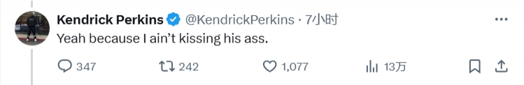 03月28日訊 去年六月,因為帕金斯批評詹姆斯搶熱度,詹姆斯在推特上取關(guān)了帕金斯。今天的節(jié)目中,帕金斯表示:“他取關(guān)了我,然后我拉黑了他的電話號碼?!?/p>帕金斯隨后還在自己的推特上補充說:“是的,因為我不想拍他馬屁。”相關(guān)內(nèi)容>>>帕金斯怒批詹姆斯蹭歐文熱度搶風頭????詹姆斯直接拉黑取關(guān)了他 本文標簽: 籃球 NBA 湖人 詹姆斯