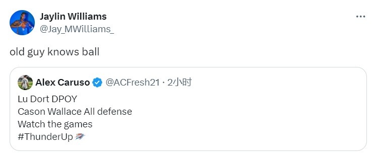 比賽結(jié)束后,卡魯索在社媒上為隊友多特和華萊士發(fā)聲,他在個人推特上寫道:“多特DPOY,華萊士最佳防守陣容。”