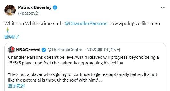 3月31日訊 湖人客場134-127力克灰熊,里夫斯砍下31分7籃板8助攻。此役過后,里夫斯本賽季場均20.1分4.5板5.9助攻,真實(shí)命中率60.8%。今天,貝弗利則打臉帕森斯,轉(zhuǎn)發(fā)了后者曾說“里夫斯15+5+5就已經(jīng)到極限了”的言論,并寫道:“白人看不起白人,無語了,像個(gè)男人一樣出來道歉!” 本文標(biāo)簽: 籃球 NBA 湖人