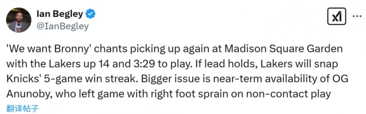 2月2日訊 NBA常規(guī)賽,湖人末節(jié)領(lǐng)先尼克斯兩位數(shù)。據(jù)尼克斯隊(duì)記Ian Begley報(bào)道,比賽第四節(jié)末段,尼克斯主場球迷喊起了“我們要布朗尼”。 本文標(biāo)簽: 籃球 NBA 湖人 布朗尼 尼克斯