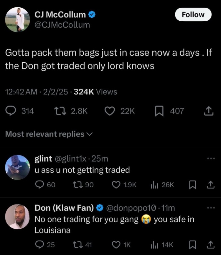 隨后,CJ-麥科勒姆更推道:“我得先把行李打包好,連東契奇都被交易了,天知道會發(fā)生什么?!?/p>